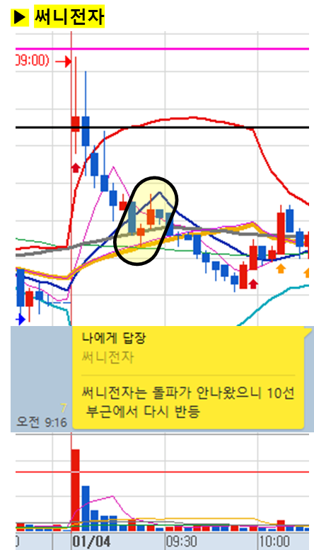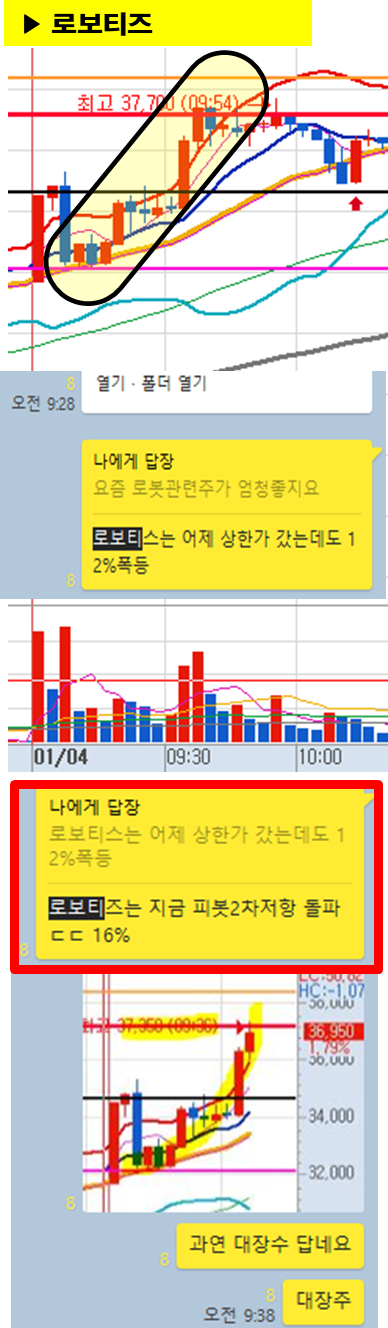관전 포인트 : 카톡 대화내용 왼쪽에 표기된 언급한 시간을 유심히 보시기 바랍니다. 그 시간이후에 주가가 어떻게 상승하고 있는지 관찰하시면 매매에 도움이 되실 겁니다.