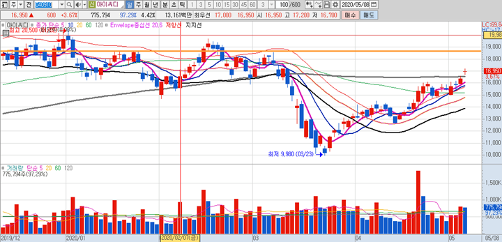 아이씨디 의 일봉차트 입니다. 일봉모습이 너무 좋게 정배열된 모습입니다. 아이씨디는 디스플레이 장비 제조 전문업체로써 최근 연속적인 외국인, 기관의 수급이 돋보이는 종목입니다. 메이저 수급은 안정된 정배열차트에서 많이 나오는데 언제까지 수급이 이어질지는 지켜봐야하며, 적정한 매수타이밍은 16000원 부근이라 보여집니다.
