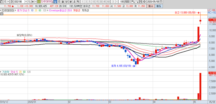 다우데이타 의 일봉차트 입니다. 다우데이타는 전일에 상한가에 갔던 종목으로 이미 현재 주식시장에서 크게 이슈가 되고 있는 종목이였습니다. 일봉상으로만 봤다면 무서워서 진입하지도 못할 종목이긴한데, 오늘 시초가 공략으로만 접근하였기에 좋은 모습으로 수익만 경험하고, 하락구간에서는 전량매도후 현찰만 보유하였기에 손실없이 이 종목을 마무리 할 수 있었습니다. 역사적인 신고가를 달성한 종목으로 해당 종목은 코로나 사태로 인해서 비대면 소비가 증가하고 있으니 반사 효과를 보기 좋은 케이스 입니다. 지난 3월 금융권에 따르면 오프라인 카드 결제금액은 10%이상 줄어든 반면에 온라인 카드 결제금액은 22%이상 급증을 했습니다. 그러다보니 증시에서 전자결제 관련주가 부각이 되고 있습니다. 다우데이타는 부가통신부문 및 결제대행업을 영위하고 있어 온라인 소비 관련주로 분류되고 있습니다.