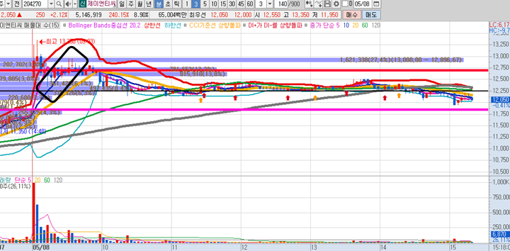 제이앤티씨 3분봉 입니다. 제이엔씨티 또한 아침에 거래량이 많이 터지면서 시초가가 너무 지나치게 높게 형성이 되어 즉시 매수를 하기에는 부담스러워서 포기를 하고 다른종목에 눈을 돌렸었습니다. 시간이 지나고 나서보니 이종목 또한 제가 하던 방법으로 먹을 구간을 주었는데, 9시12분경 12350부근에 매수타점이 왔었었고, 약 15분 후에 12950원 부근에 매도시 약 5%의 수익이 나왔던 구간이 있었습니다.