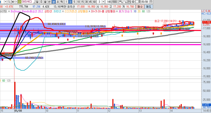 아이씨디 3분봉 입니다. 아이씨디를 전일 2시30분경에 발견하여 공유했습니다. 이 종목 또한 거래량이 늘면서 상승이 나온종목이였는데, 그당시 안전하게 지지한다고 판단하여 매수하였고, 약 수익으로 종가배팅이 종료되었습니다. 다음날 시초가에 약 4%정도 수익을 챙기고 나왔는데 보시는 차트처럼 시초가에 갭상승을 시키고 특별히 하락도 없이 무난하게 옆으로만 가고 있다가 막판에 조금더 상승하였습니다. 저는 일찍이 수익을 실현하고 계속 홀딩하지 않고 기회비용을 오늘의 다른 종목을 매매하기 위해 사용하였습니다.