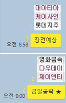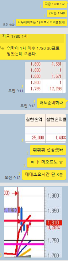 오늘은 금요일장인 만큼 특별히 조심하여 매매하기로 생각했습니다. 실제 오전매매는 9시 30분 이내에 종료하였으며, 오후장에도 당대 최대이슈가 되는 종목만을 골라서 매매하였습니다. 오늘 작성되는 글은 오전 매매(上편) 오후 매매(下편)으로 나눠서 작성하도록 하겠습니다. 그럼 차트와 카톡내용을 함께 보면서 설명드리겠습니다.