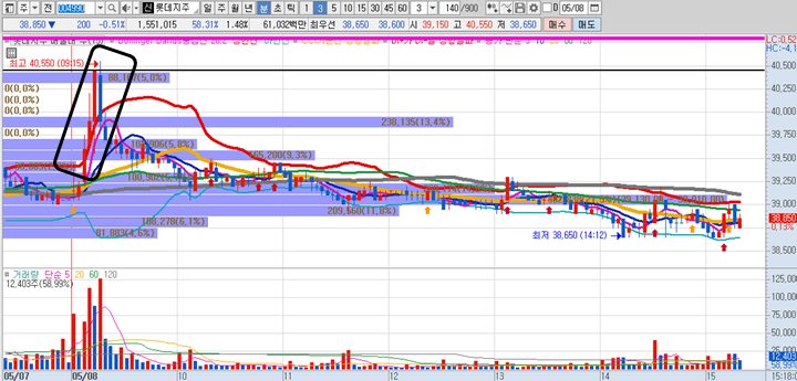 롯데지주 3분봉 입니다. 시작은 천천히 20일선 부근에 양봉으로 시작을 하였습니다. 그이후에 10분 이상 거래량이 많이 붙으면서 길다란 양봉3개가 출현하며 급등이 나왔습니다. 매도 타이밍으로 꼽을 수 있었던 지저(최고점) 40550원의 경우 피봇1차저항으로 절반이상 매도하면서 먼저 수익을 실현할 수 있었던 종목이며, 이종목은 그 이후 가까이에있었던 전일고점까지 돌파하지 못하여 결국 무너지면서 하루종일 오를 생각을 안한 종목이였습니다.