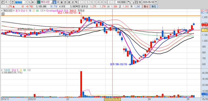 케이사인 의 일봉차트 입니다. 3월 19일 최저점이후에 2배이상 상승한 종목이며 모든 이동평균선이 우상향으로 상승추세에 있는 종목입니다. 이번주에 4일동안 외국인이 계속적인 매수를 하여 외국인 수급이 많이 있었던 종목인데 오늘의 경우에는 외인이 대부분 매도하고 그 물량을 개인들이 다 받은 상황입니다. 다음주에 다소 조정이 있은 후에 다시 재반등을 노려봐야할 것 같습니다.