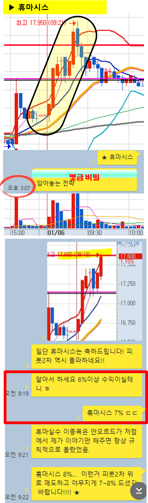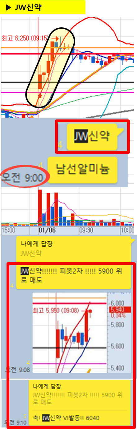 관전 포인트 : 카톡 대화내용 왼쪽에 표기된 언급한 시간을 유심히 보시기 바랍니다. 그 시간이후에 주가가 어떻게 상승하고 있는지 관찰하시면 매매에 도움이 되실 겁니다.