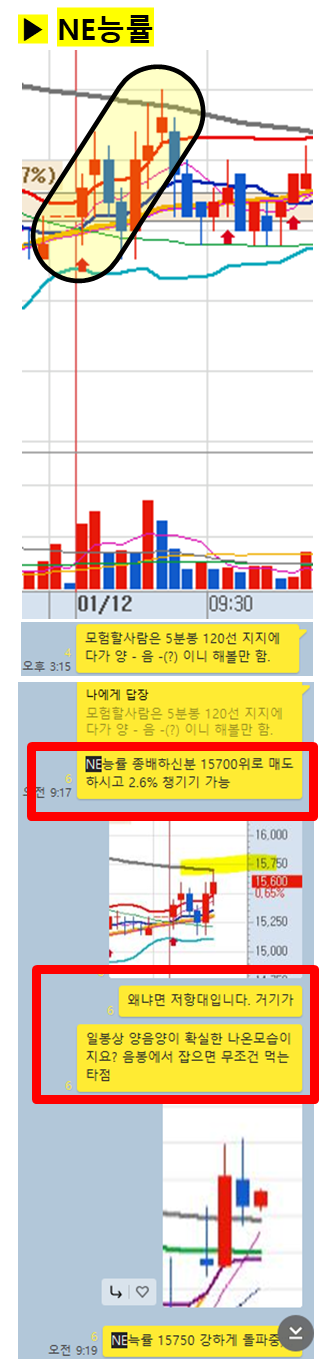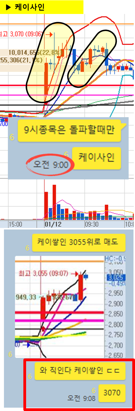 관전 포인트 : 카톡 대화내용 왼쪽에 표기된 언급한 시간을 유심히 보시기 바랍니다. 그 시간이후에 주가가 어떻게 상승하고 있는지 관찰하시면 매매에 도움이 되실 겁니다.