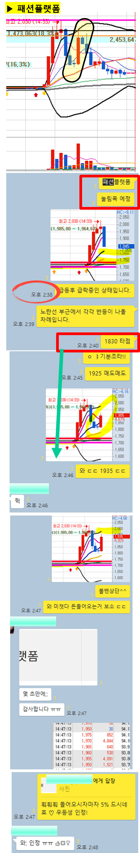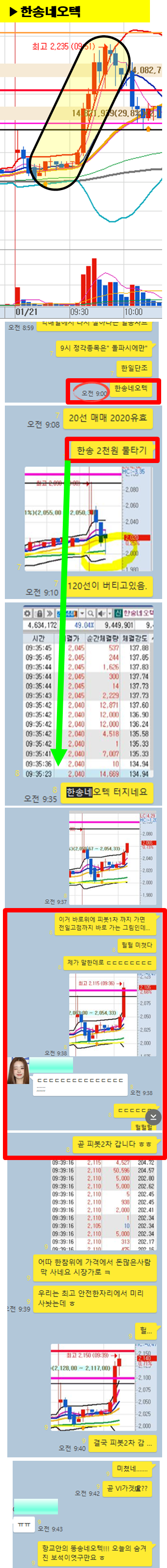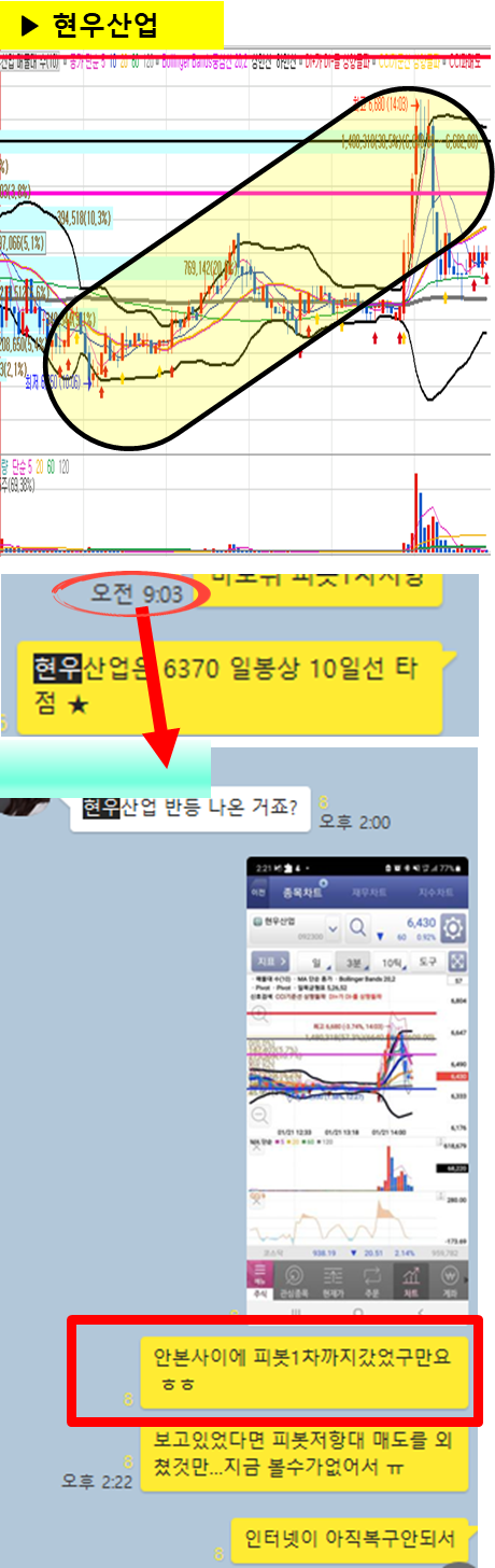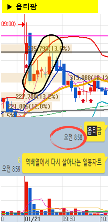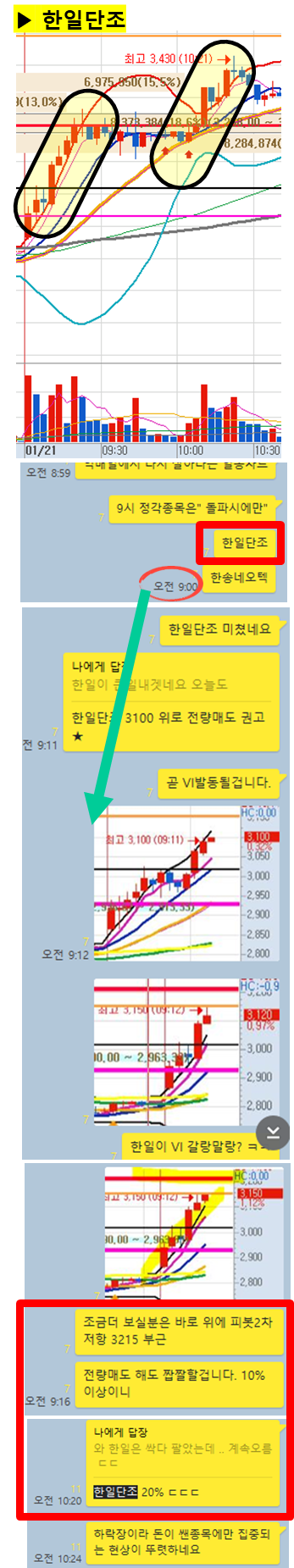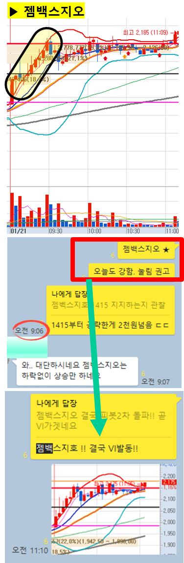 관전 포인트 : 카톡 대화내용 왼쪽에 표기된 언급한 시간을 유심히 보시기 바랍니다. 그 시간이후에 주가가 어떻게 상승하고 있는지 관찰하시면 매매에 도움이 되실 겁니다.