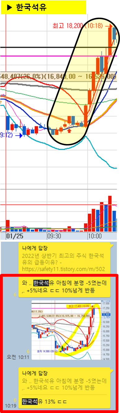 관전 포인트 : 카톡 대화내용 왼쪽에 표기된 언급한 시간을 유심히 보시기 바랍니다. 그 시간이후에 주가가 어떻게 상승하고 있는지 관찰하시면 매매에 도움이 되실 겁니다.
