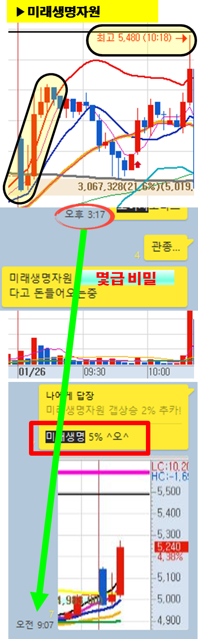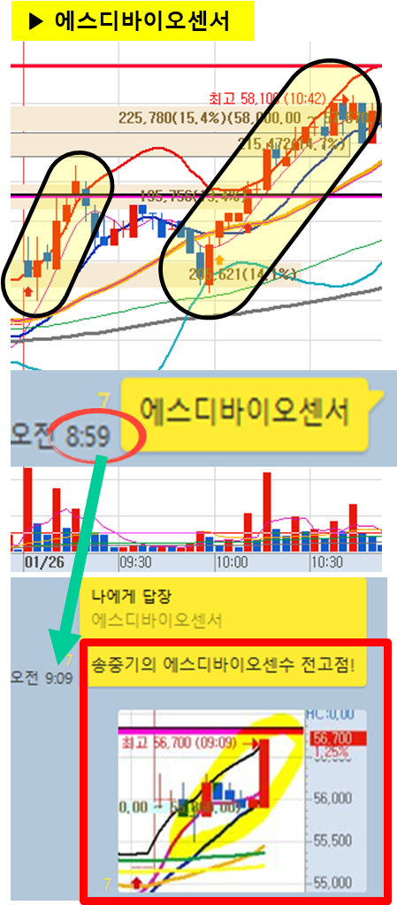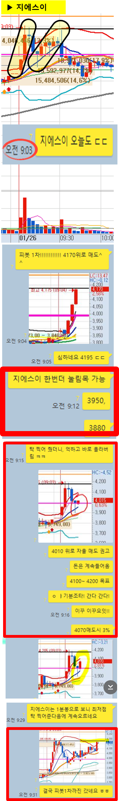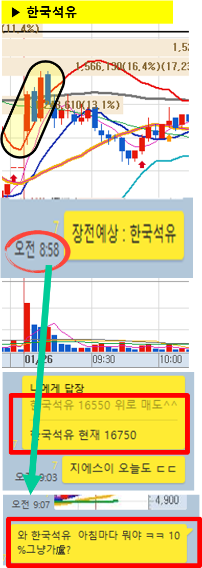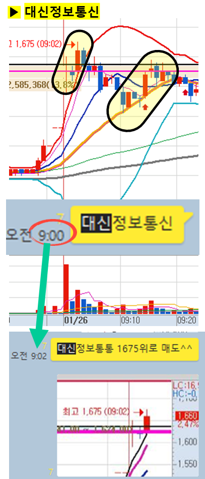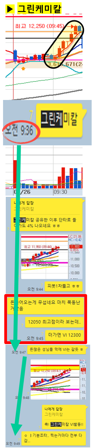 관전 포인트 : 카톡 대화내용 왼쪽에 표기된 언급한 시간을 유심히 보시기 바랍니다. 그 시간이후에 주가가 어떻게 상승하고 있는지 관찰하시면 매매에 도움이 되실 겁니다.