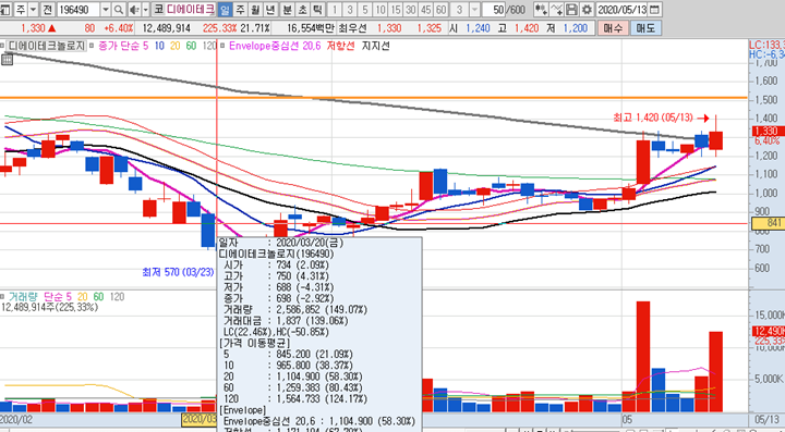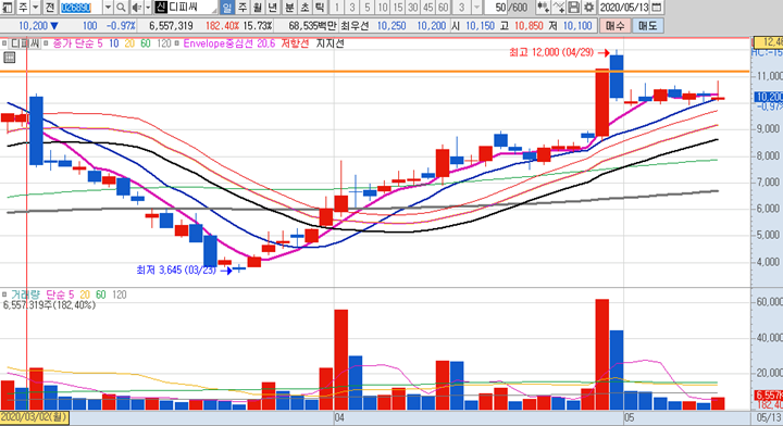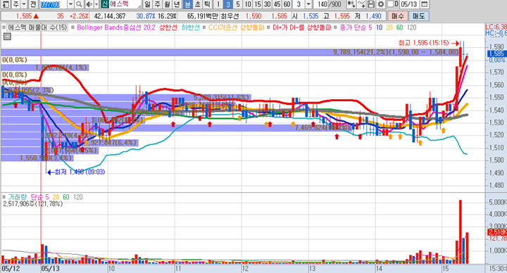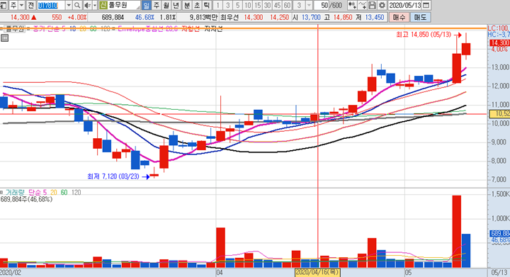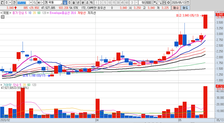 국동의 일봉차트 입니다. 제 관심종목을 살펴보니 5월 4일과 5월 7일에도 선정을 해둔 종목입니다. 그 당시에도 상승세를 유지하고 있었던 차트로 어제 10일선 근처까지 빠졌지만 절대 10일선을 깨지않았으며 오늘은 시초가부터 급등이 나오면서 엄청난 거래량이 터지면서 상한가 까지 진입을 하였습니다.