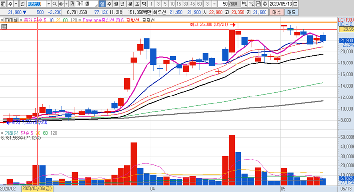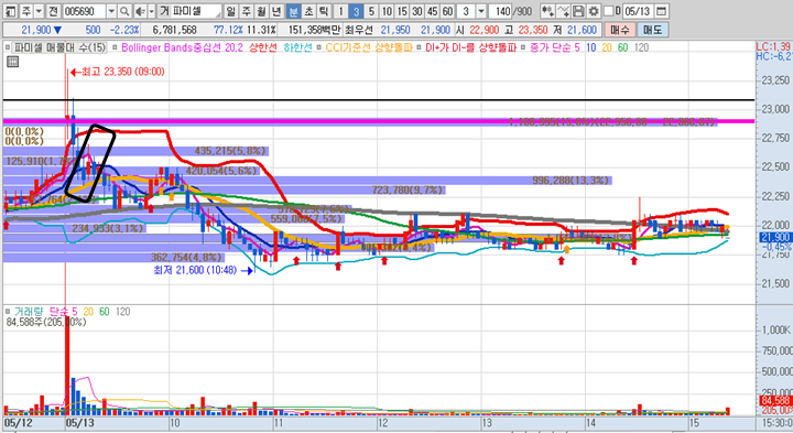 파미셀 의 일봉차트 입니다. 일봉위치가 좋은 종목이였습니다. 그러나 오늘은 시초가에만 크게 갭상승을 시키고 전체적인 흐름은 하루종일 하락한 흐름이였는데 21600원 최저점이후에는 더 이상 떨어지지않고 반등도 한번씩 나오면서 결국 전일 대비 2프로 정도 마이너스로 종료가 되었습니다. 아마 내일 다시 급등할 확률도 있다고 보는게 오늘의 고점 23350원 대를 뚫어준다면 다시 긴양봉으로 마감될 수 있어 보입니다.
