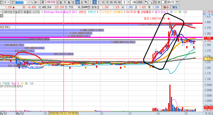 디에이티테크놀로지 3분봉 입니다. 어제 장시작전 예상종목으로 선정한 종목입니다. 오전내내 잠잠하였고 오후2시 이후부터 긴 양봉이 하나 나오기 시작하면서 차트가 다시 우상향으로 바뀌면서 이동평균선도 정배열이 되어 급등 준비를 완료하였고, 피봇1차저항과 전일고점을 더 큰 거래량으로 뚫어버리면서 피봇2차저항 까지 쉽게 돌파하면서 갑작스러운 큰시세가 나온 종목입니다.