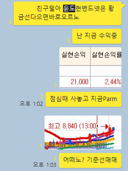 어제에 이어 오늘도 바쁜 업무로 인해 주식시장에 적극적으로 참여를 하지 못했습니다. 그래서 오늘 선정한 공략종목 2개중에 1개가 상한가에 진입(국동)했는데도 달콤한 수익을 맛보지는 못했습니다. 그래도 오늘 제가 결정한 종목에 대해 하나씩 카카오톡 대화내용과 차트를 보면서 복기 해보도록 하겠습니다.