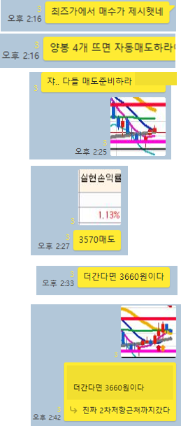 NE능률 3분봉 입니다. 최초 눈에 띈것은 거래량이 많아진 1시 이후였는데, 역시 성급하게 뇌동매매를 하지 않기 때문에 한참을 기다린후에야 매수타점을 언급하였습니다. 그 당시 3분봉상 120선이였으며, 제가 보기에 매물대차트에 바로 위에있는 매물대차트 아랫부근가격을 보수적으로 봤을 때 3530원으로 확인했습니다. 그래서 그 가격이하로는 떨어 지지 않겠다고 공유하면서 매수를 하고 양봉 4개이상 나오는 구간이 있었습니다. 이 종목은 저도 함께 매수하여 1%이상의 수익을 챙겼지만 피봇2차저항 가까이상승하여 몇분더 보유시에 3%이상의 수익이 나온 구간이였습니다.(3530원 → 3645원)