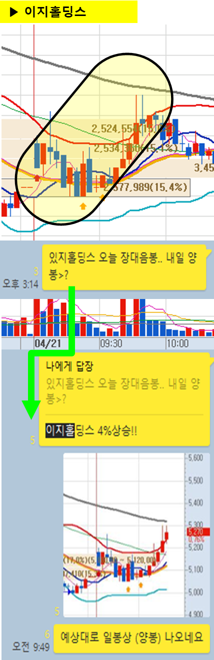 ⊙ 결론 : 어제 마감전 양봉을 예상하였고 오늘 아침 4%이상의 상승이 나왔음.
