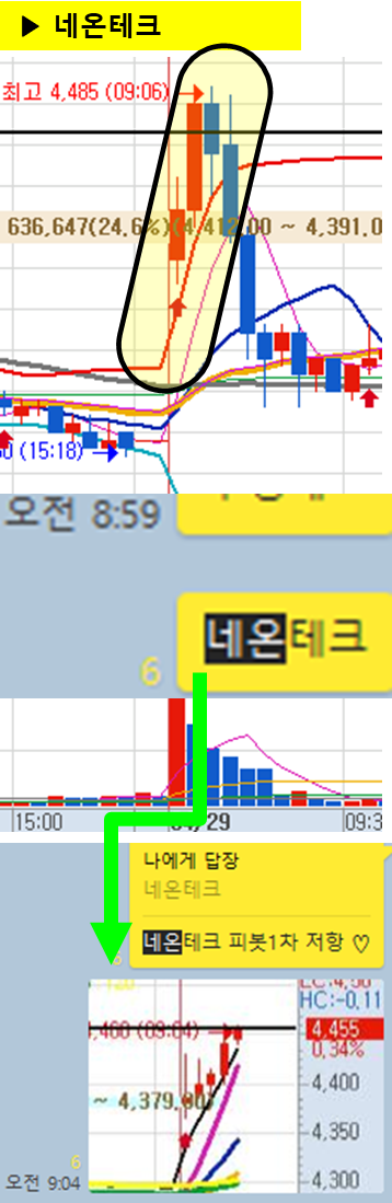 ⊙ 상승흐름분석 : 어제 장전예상 종목으로 오후 급등이 나왔고, 최고점마감을 예상함. 다음날 → 9% 갭상승!