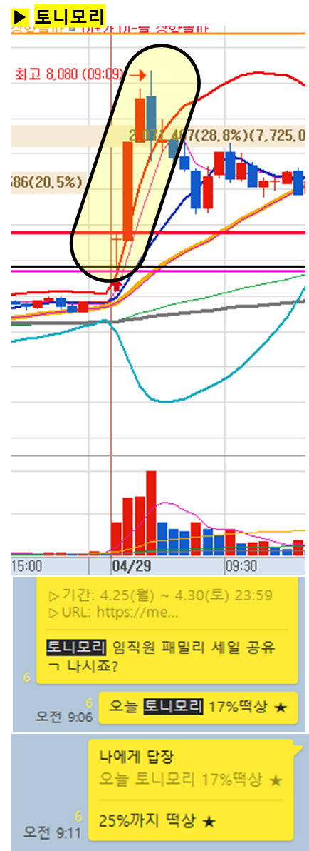 (차트에서 노란색 음영으로 표시된 부분과 카톡 대화 시간을 유심히 봐주세요)