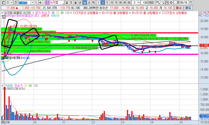 뉴지랩 3분봉 입니다. 시초가에 큰거래량이 생기면서 갭상승이 나온 종목입니다. 이 종목은 긴 양봉이후에 거래량이 점점 하락하며 매도로 돌아서며 5일선근처로 붙고 있었습니다. 그래서 매수를 선택한 종목인데, 신속히 4%가까운 수익이 발생한 종목입니다. 그 이후에 피봇 2차저항 마져 뚫으면서 최고 19450원까지 급하게 상승한 종목입니다. 그 이후 곧바로 상한가는 가지 못했으며, (황금 지지선)20일 이동평균선까지 하락하고, 그 선이 닿자 양봉 3개가 나오면서 약 4.3%이상의 수익구간이 한번 더 나왔습니다. (당시 가격 : 17650원 → 18450원) 그리고 마지막 네모박스 구간인 3분봉 120선인 12시 24분경 16850원 부근을 터치하며 바로 양봉3개가 나오면서 17500원까지만 보더라도 약 3.7%이상의 수익이 실현가능한 구간이 있었습니다. 이 처럼 시초가에 갭을 띄우고 점점하락한 종목이지만 의미있게 지지하는 구간에서만 매매했어도 4프로 가까이 3번씩 챙길 수 있는 종목이였습니다.