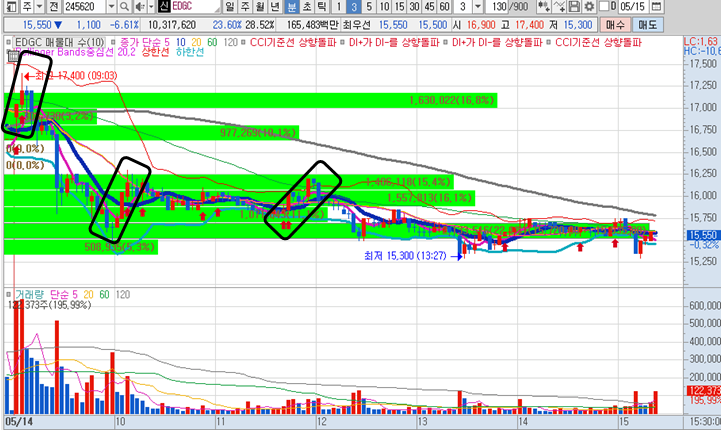 EDGC 3분봉 입니다. 장시작전부터 발굴을 하였으며 시초가에 큰 거래량이 생기면서 갭상승이 나온 종목입니다. 몇일전부터 계속해서 매매해온 종목이라 이렇게 장전에 발견되었다는 것에 크게 놀랍지도 않았습니다. 그러나 오늘 다른 진단키트주와 달리 꾀 크게 하락을 한 종목입니다. 앞서 말씀드린 수젠텍과 동일한 테마일텐데, 어떤종목은 오르고 어떤종목은 하락하는가에 대한 설명은 회사 내부적인 사항도 있겠고 여러가지가 있겠지만, 당일 단타매매하는 사람입장에서 보면 거래량 급등이후에 지지해야하는 구간이 크게 무너지면서 하락추세로 접어들었다고 할 수 있습니다. 반드시 지켜야될 곳은 지키는게 좋은데 그걸 무너뜨리면 이렇게 크게 급락이 나오는 것 입니다. 그렇지만 하락하는 와중에도 수직으로 떨어지는게 아니라 특정구간에서는 그걸 발판으로 다시 딛고 일어서는 구간이 있는데 그구간을 체크해봤습니다. 하락시에 하락을 멉추고 다시 돌릴만한 구간인 볼린저밴드 하단선들인데 이때는 주요한 매수타점으로 매수시에 양봉3~4개정도 보고 매도로 대응한다면 하락하는 종목에서도 누구나 이기는 매매를 했을 겁니다.