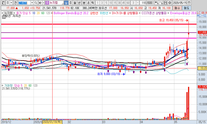 뉴지랩 자회사에서 코로나 치료제 개발에 합류했다는 소식이 알려지면서 최근 시세급등을 견인했다고 볼 수 있습니다. 평상시에 비해 거래량이 4~5배 이상이나 터지면서 현재의 시국을 잘 반영하고 있는 듯 합니다. 이 가격에서 다시 급등한다면 손을 댈 수 도 없겠지만, 조금 조정이 나와준다면 함께 매수할 구간이 또 오리라 봅니다.