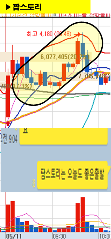 ⊙ 결론 : 장 시작전에 일봉상태를 보고 상승을 예상하여 미리 공유하였고, 24분만에 6%상승이 나옴