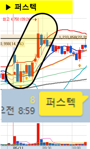 ⊙ 결론 : 장 시작전에 일봉상태를 보고 상승을 예상하여 미리 공유하였고, 1분만에 5%상승이 나왔으나 120선 저항에 부딪히며 힘을 못쓰는 상황