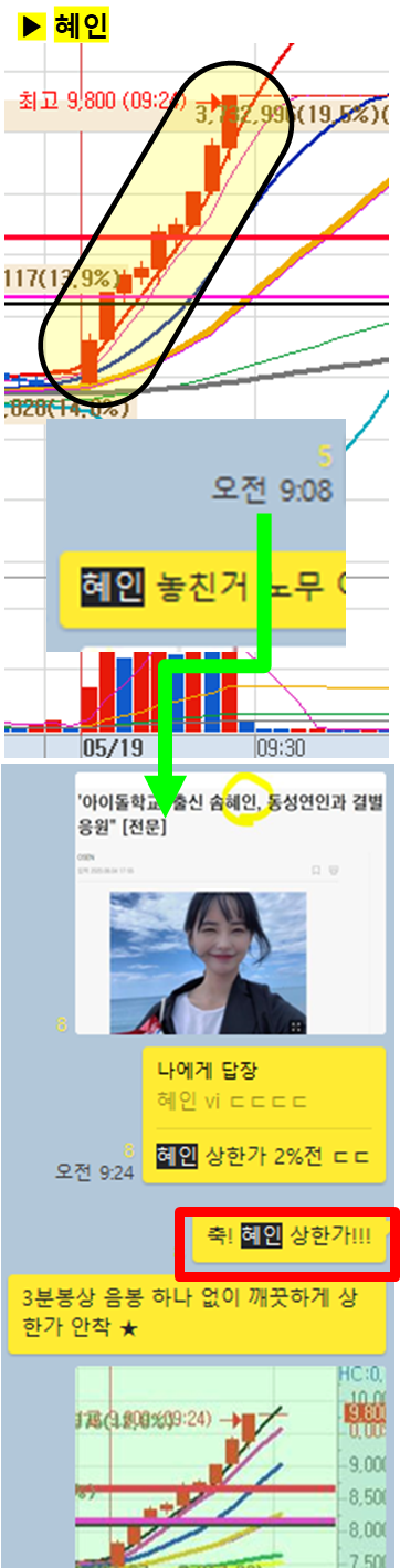 ⊙ 결론 : 어제 공유 및 공략 종목으로 오늘은 45분만에 18%가까운 폭등이 나옴.