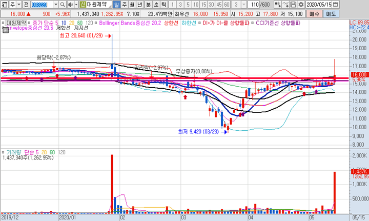 대원제약 의 일봉차트 입니다. 그동안 횡보하던 모습에서 오늘 거래량이 많이 터지면서 크게 급등이 나왔습니다. 대원제약은 코로나바이러스 치료 목적으로 사용되는 정맥 마취제 “프리플MCT주(성분명 프로포폴)를 룩셈부르크로 긴급 수출한다는 소식이 이미 있었으며, 코로나 치료와 관련하여 상승가능성이 많은 종목입니다. 금요일은 긴 윗꼬리가 달린 양봉으로 마감했으며, 다음주에 조금더 시세가 나올 구간이 있는지 계속 지켜보도록하겠습니다.