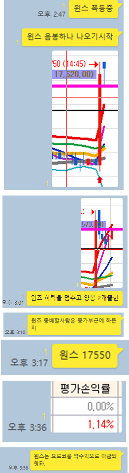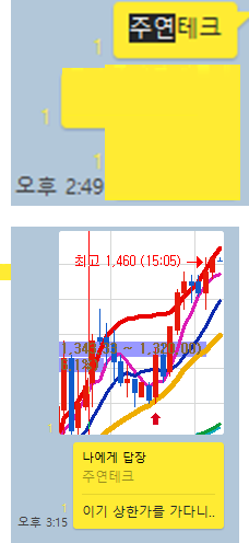 위에는 3분봉차트고, 카카오톡 대화내용상에는 5분봉입니다. 시초가 및 오전에는 거의 3분봉위주로 보지만, 시간이 지날 수록 5분봉을 함께보면서 지지하는 구간을 찾는데 당시 5분봉으로 보면 15분동안 양봉이 3개가 나오면서 약 6%가까운 수익이 발생한 구간입니다. (4470원 → 4740원) 그리고 그가격에서 크게 밀리지않으니 결국에는 장중에 상한가에 진입하는 강력한 모습을 보여줬습니다.