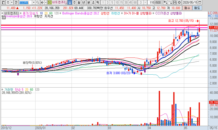 비트컴퓨터 의 일봉차트 입니다. 목요일 매매에서도 일봉차트에 대한 분석을 올린내용이있습니다.