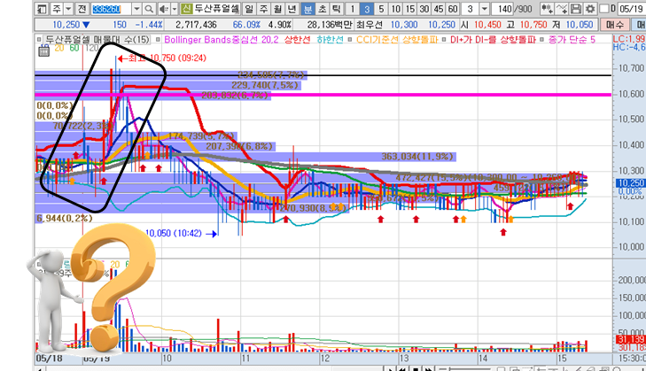 두산퓨얼셀의 일봉차트 입니다. 5일선을 계속해서 지키면서 5일선 부근에서 마감된 종목입니다. 어제 종배를 했다면 수익실현가능 구간이 있었는데, 오늘 상승장임에도 불구하고 그 이후 오후상황은 별로 좋지않았습니다. 거래량이 전일에 비해 또 줄어들었고 다시 10일선까지 하락했다가 올릴련지 꾸준히 확인해봐야할 것 같습니다.