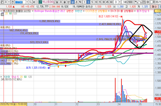 넥스트아이 의 일봉차트 입니다. 전일에 십자형 음봉캔들로 바감하고 오늘 긴 양봉이 출현했습니다. 오늘 급등으로 인해 단기 최고점이 나왔습니다. 앞으로도 계속 상승하는지 지켜봐야겠습니다.
