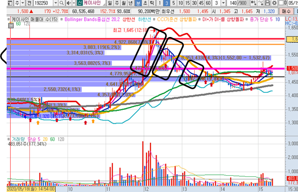 케이사인의 일봉차트 입니다. 일봉상 전일 거래량보다 많은 거래량이 나오면서 주가도 급등이 나왔습니다. 바로 다시 진입하기엔 부담스러운 일봉위치입니다.