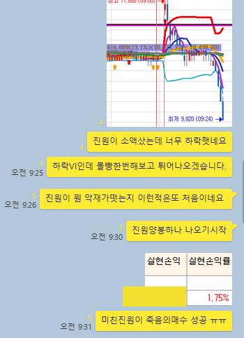 어제 종가배팅한 두산퓨얼셀도 역시 수익으로 매도하면서 출발하였습니다. 그러나 오늘 아침장은 제약주가 특이하게 많이 급락하면서 대응하기 어려운 장이였습니다. 특히 진원생명과학의 경우 지지선을 무참히 깨버리면서 분봉상 장대음봉이 나오면서 급락을 하다가 볼린져밴드 바깥으로 주가가 떨어지면서 타점에서 다시 계속 오르는 현상을 경험했고, 나머지 매매를 시도한 다른 종목들도 힘겹게 수익을 내고 나왔기에 오늘은 다소 어렵게 느껴진 장이였습니다. 그럼 카카오톡 내용과 차트상황을 보면서 자세히 이야기 해보겠습니다.