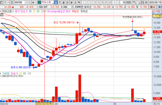 키이스트 의 일봉차트 입니다. 액면병합으로 인한 거래정지 이후에 거래량이 여전히 활발한 종목입니다. 일봉이 나름대로 괜찮은 방향으로 흘러가고 있습니다. 외국인 주체 수급이 계속보이는게 인상적이네요.