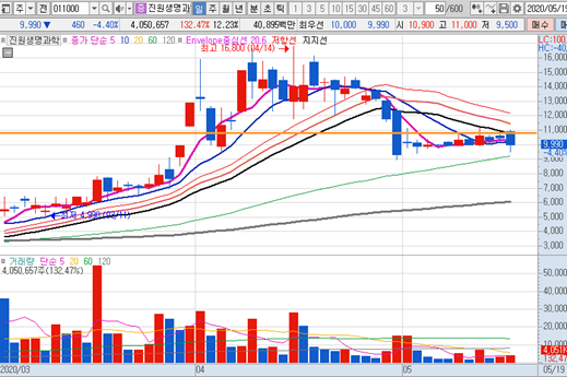 진원생명과학의 일봉차트 입니다. 일봉차트가 큰 변화없이 옆으로만 가다가 이게 이제 위냐 아래냐 방향을 결정하는 중요한 날이였습니다. 오늘 아침에 원인모를 폭락이후에 볼린저밴드 바깥선에서 공포의 매수를 하여 겨우 살아 나왔긴 하지만, 앞으로 이종목은 하방으로 갈 확률을 예상합니다 60일선을 지지하고 다시 반등하는 수도 있으니 그 가격대인 9천원대 부근을 깨지않고 지키는지도 잘 관찰해야겠습니다.