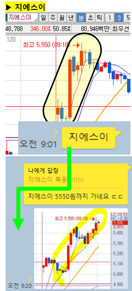 ⊙ 최고점 : 5550원(9시18분) 피봇2차저항 ~ VI전