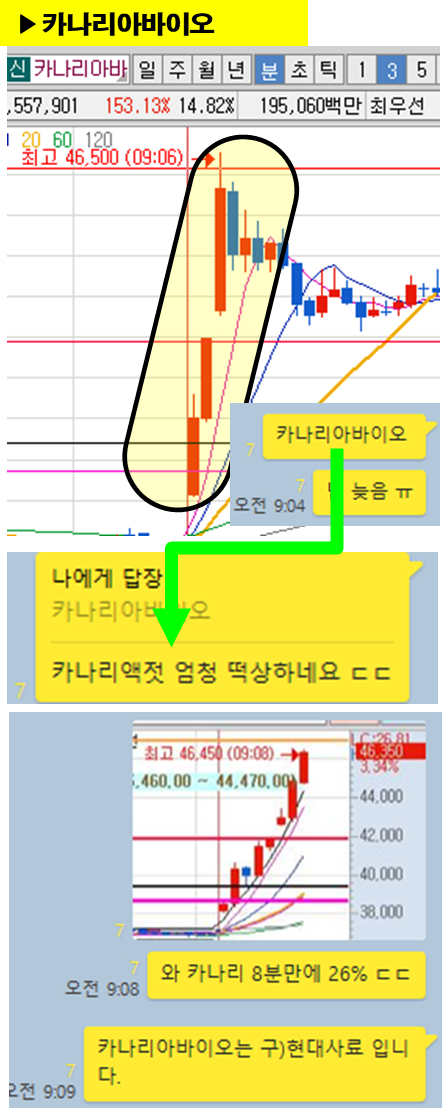 ⊙ 최고점 : 46500원(9시8분) 상한가 전