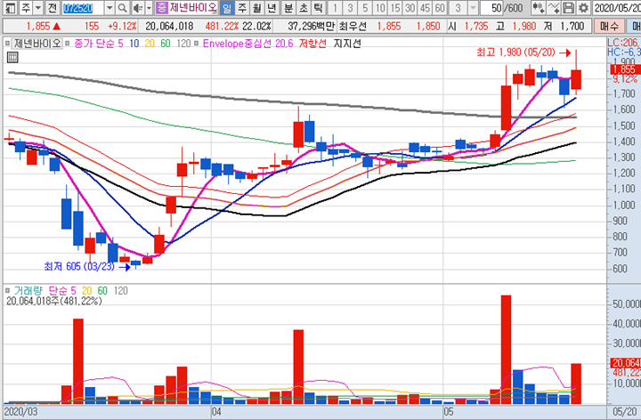 제넨바이오의 일봉차트 입니다. 과거에 모 전문가가 아마 현재 가격부근에서 추천하고 난뒤에 600원대 까지 급락을 한 안좋은 기억을 갖고 있는 종목입니다. 그러나 최고 저점이후에 꾸준히 상승하여 현재는 다시 그 가격이상으로 회복된상태입니다. 아마 수익률이 반토막이상 마이너스되면서 계속 보유중인사람은 드물겠지만, 떨어지면 하염없이 떨어지는 종목의 특성이 있는 것 같습니다. 오늘 제넨바이오를 선정한 가장 큰 이유는 어제 음봉이지만 아랫꼬리가 달린음봉으로서, 10일선을 정확하게 지지해주면서 마감이 되었기 때문에 오늘도 많이 떨어져봤자 그 10일선 구간이겠구나 확신을 하고 선정을 했습니다. 차트를 대충봐도 아침단타만했다 하더라도 전일고점인 1800원대에만 팔고나왔어도 꾀 짭짤한 수익을 챙길 수 있었던 종목입니다.