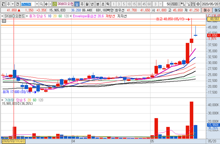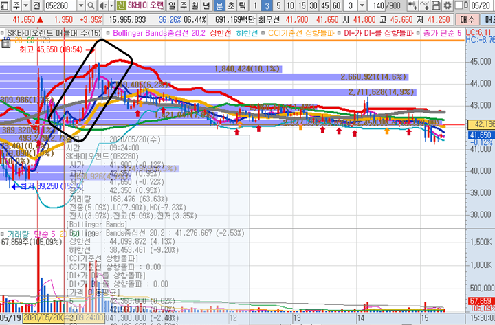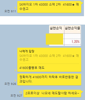 SK바이오랜드 3분봉 입니다. 시초가에 큰 거래량으로 급등이 나온종목입니다. 침착하게 기다리면서 매수 타점을 검토하였으며 1차 43000원 부근 소액매수, 2차 41600원 많은 물량 매수라고 알려주었으며, 정말 정확하게 41600원 가격을 찍으면서 바로 반등이 나오면서 크게 급등한 종목입니다. 개인적으로 그 당시 매수했던 41600원에서 최고가인 45650원까지 보유했다면 수익률은 무려 9%에 가까운 수익을 실현할 수 있었습니다.