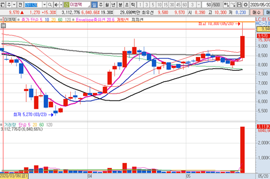 이엠텍의 일봉차트 입니다. 그동안에 거래량이 거의 없는 종목이였지만 오늘의 이렇게 대시세가 나오면서 거래량도 엄청나게 많아진 종목입니다. 아마 당분간 상승세를 유지하지 않을까 생각하는데, 조정시에 매수 가능한 구간에서만 대응하도록 하겠습니다.