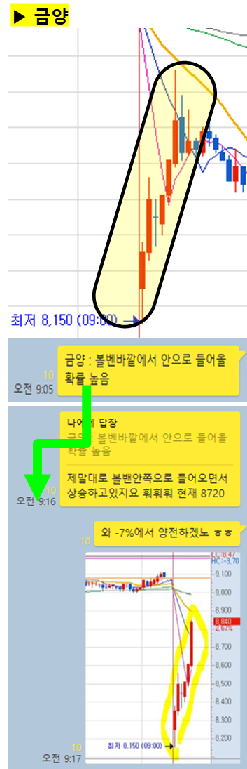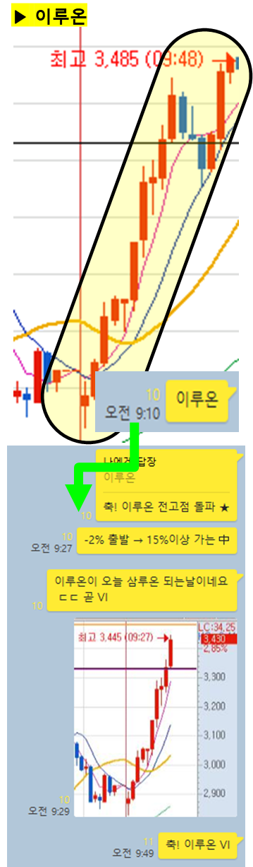 ⊙ 결론 : 급락 출발했지만 상승을 예상하고 공유하였고, 시초가 대비 8%이상 상승 폭이 15분만에 발생!