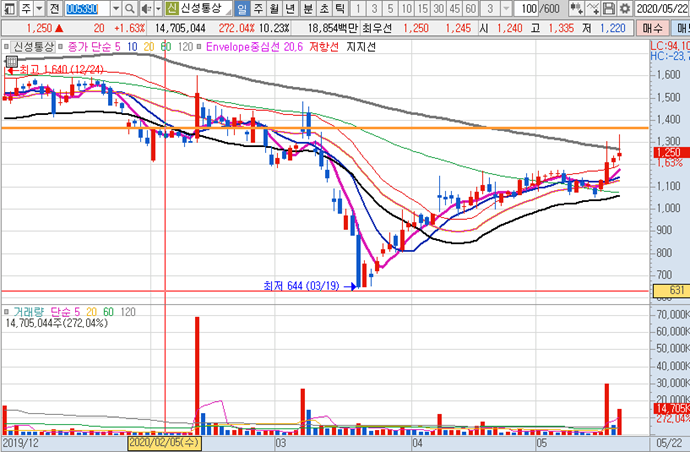 신성통상의 일봉차트 입니다. 2일전에 거래량이 많이 발생하면서 윗꼬리 달린 양봉으로 마감한 종목입니다. 그리하여 전일에도 아침에 제법 큰 물량을 보면서 오늘 전일고점 돌파할 수 도 있겠다 생각했지만, 어제는 전일고점을 바로 돌파하지는 못하면서 짧은 양봉으로 마감이후에 오늘 전일의 고점을 갱신해버리면서, 급등시세가 아침일찍이 나왔었습니다.