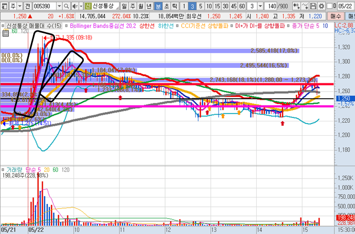 신성통상 3분봉 입니다. 어제 시초가에 전일고점돌파가 가능하다고 이야기한 종목입니다. 어제는 아무래도 전일고점이 상대적으로 높은 위치에 있었으므로 바로 뚫지는 못하였는데, 오늘 이렇게 아침장 시작이후 전일고점을 힘차게 뚫어주면서 피봇2차저항도 뚫어버리고 크게 급등을 하였습니다. 시초가 1230원에서 1335원 까지는 약 8%가까운 수익구간이였는데, 워낙에 급하게 올라간 탓에 다시 지지하는 라인까지 내려왔는데, 이때가 1265원 부근입니다. 그 가격을 터지하자마자 다시 약 20분간 상승구간이 있었으며 최대 3%이상의 수익구간이 다시나온 종목입니다.