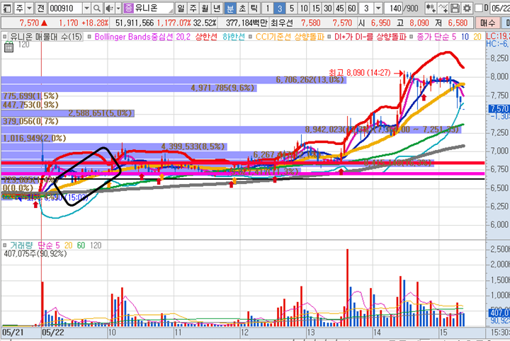 유니온 3분봉 입니다. 유니온은 최근 엄청 핫한 이슈가 있는 종목으로 요즘 단골 종목입니다. 오늘도 시초가에 갭상승으로 띄우면서 몇일간 물려있던 제 지인도 큰 수익으로 탈출할 수 있었던 종목인데, 유니온의 경우 침착하게 매수가격을 검토하다가 6610원이라고 미리 알려주었습니다. 저는 매수주문을 넣어 둔 상태로 기다리는데 잠시 한눈을 팔던 사이에 매수가 된 상태로 1%수익이 된 상태를 보고 바로 매도했지만 그 이후부터 본격적으로 시세가 나면서 매도하자마자 전일고점을 돌파하면서 우상향했습니다. 급기야 오후장에는 상한가 근처까지 상승하는 것을 봤습니다. 금요일 장의 경우 코스피, 코스닥 양 지수모두 하락하면서 좋지 않은 장이였기에 수익시에는 바로 매도하는 것을 생각했는데, 이 종목이 이렇게 까지 강력할 줄은 몰랐습니다. T_T