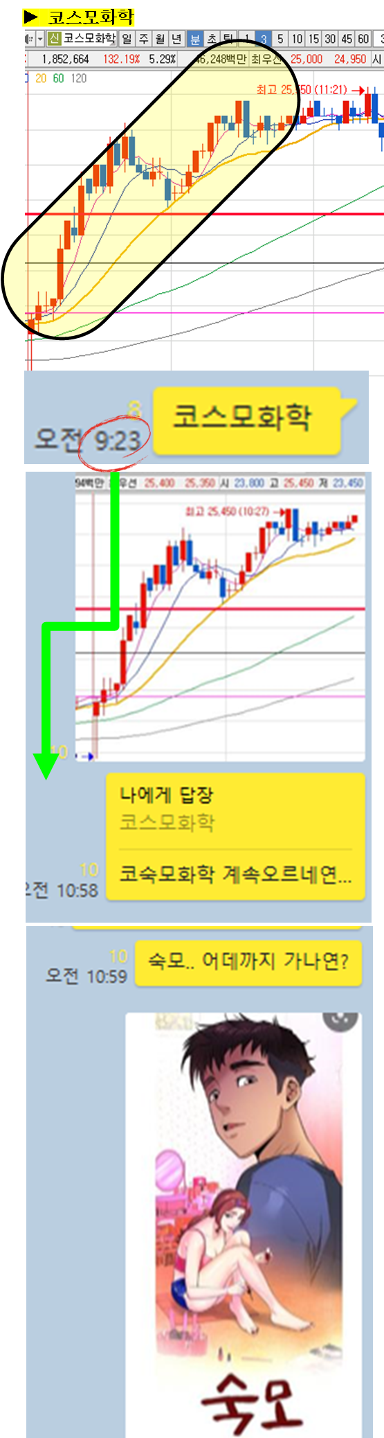 주식종목을 공유한 이후 주식의 움직임에 대해 그 현장을 생생하게 박제하여 생동감 있게 보여드리겠습니다. (차트에서 노란색 음영으로 표시된 부분을 자세히 봐주세요)