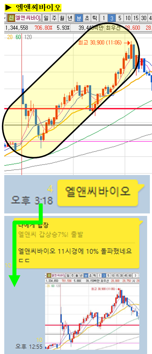 주식종목을 공유한 이후 주식의 움직임에 대해 그 현장을 생생하게 박제하여 생동감 있게 보여드리겠습니다. (차트에서 노란색 음영으로 표시된 부분을 자세히 봐주세요)
