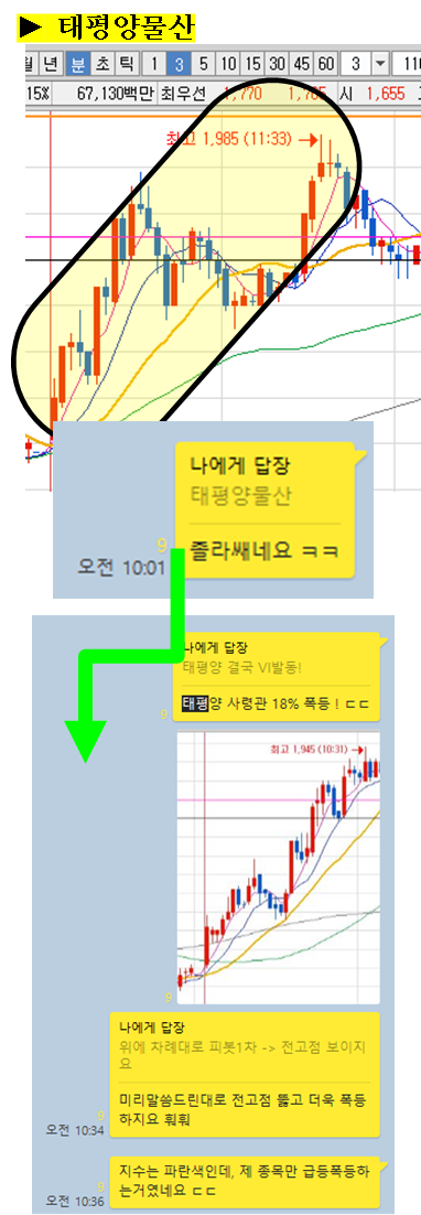 주식종목을 공유한 이후 주식의 움직임에 대해 그 현장을 생생하게 박제하여 생동감 있게 보여드리겠습니다. (차트에서 노란색 음영으로 표시된 부분을 자세히 봐주세요)