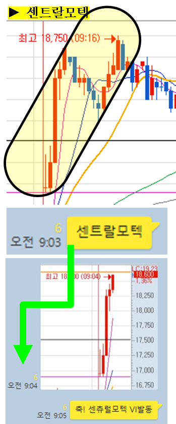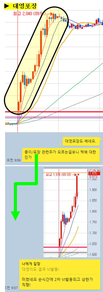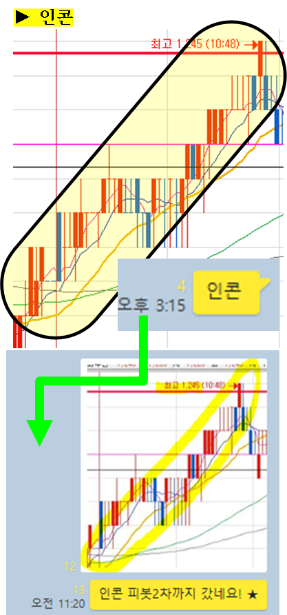 주식종목을 공유한 이후 주식의 움직임에 대해 그 현장을 생생하게 박제하여 생동감 있게 보여드리겠습니다. (차트에서 노란색 음영으로 표시된 부분을 자세히 봐주세요)