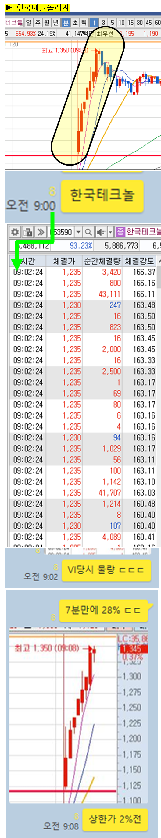 장 시작과 동시에 공유한 한국테크놀러지는 6%상승 출발이후 28% 폭등하는데 단 8분이 걸린 대박 종목입니다. 일분봉을 보시면 8분간 광란의 질주를 한 모습이 보일 것이고, VI당시 들어온 물량폭탄세레를 함께 확인할 수 있습니다.